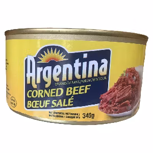 EN: Boiled Corned Beef (beef with water, salt, sugar, sodium phosphates, sodium nitrite), beef broth, beef tallow, soy protein isolate, textured soy concentrate (added caramel color), salt, monosodium glutamate, aroma (hydrolyzed soy protein gluten protein, wheat mayo protein yeast extract), garlic powder, sugar, dextrose spiced onion powder, xanthan gum.